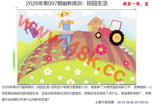 (1)2026年第097期幽默猜测(田园生活):浩克是个聪明又勤劳的小伙,他放弃了大城市里的高薪工作,选择独自一人享受着自由自在的田园生活,这里没有烦恼也没有尔虞我诈,但他还是觉得差了点什么,他需要的是啥?...本期图片会给我们带来什么样的玄机呢?